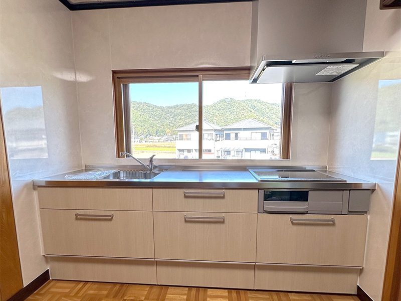 吊戸棚無し・キッチンパネルを両サイドに貼ることによって清掃性がアップしました。
