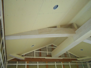 今回、最もお客様が悩まれていたのが、むきだしになる昔ながらの丸太梁。これを見せるか、化粧仕上げにするかで検討されましたが、工事前にイメージパースを何種類か見て化粧仕上げにすることに決まりました。清潔感溢れる素敵な天井に仕上がったと思います。